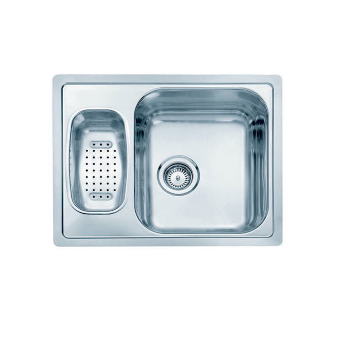 Stålvask 1½ kumme med strainer. For under- eller planlimning. Vendbar. Leveres med skylleskål i stål. Hanehul kan bestilles