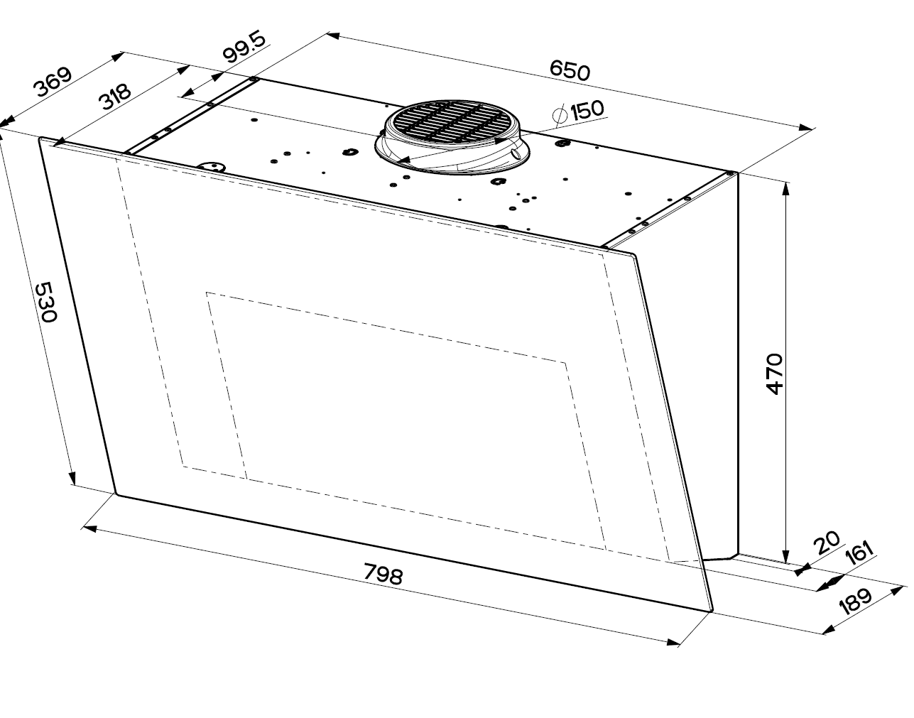 Vægmonteret emfang, skråtstillet. Med intern motor - Sort / sort glas - 800 mm - A - Model for recirkulation