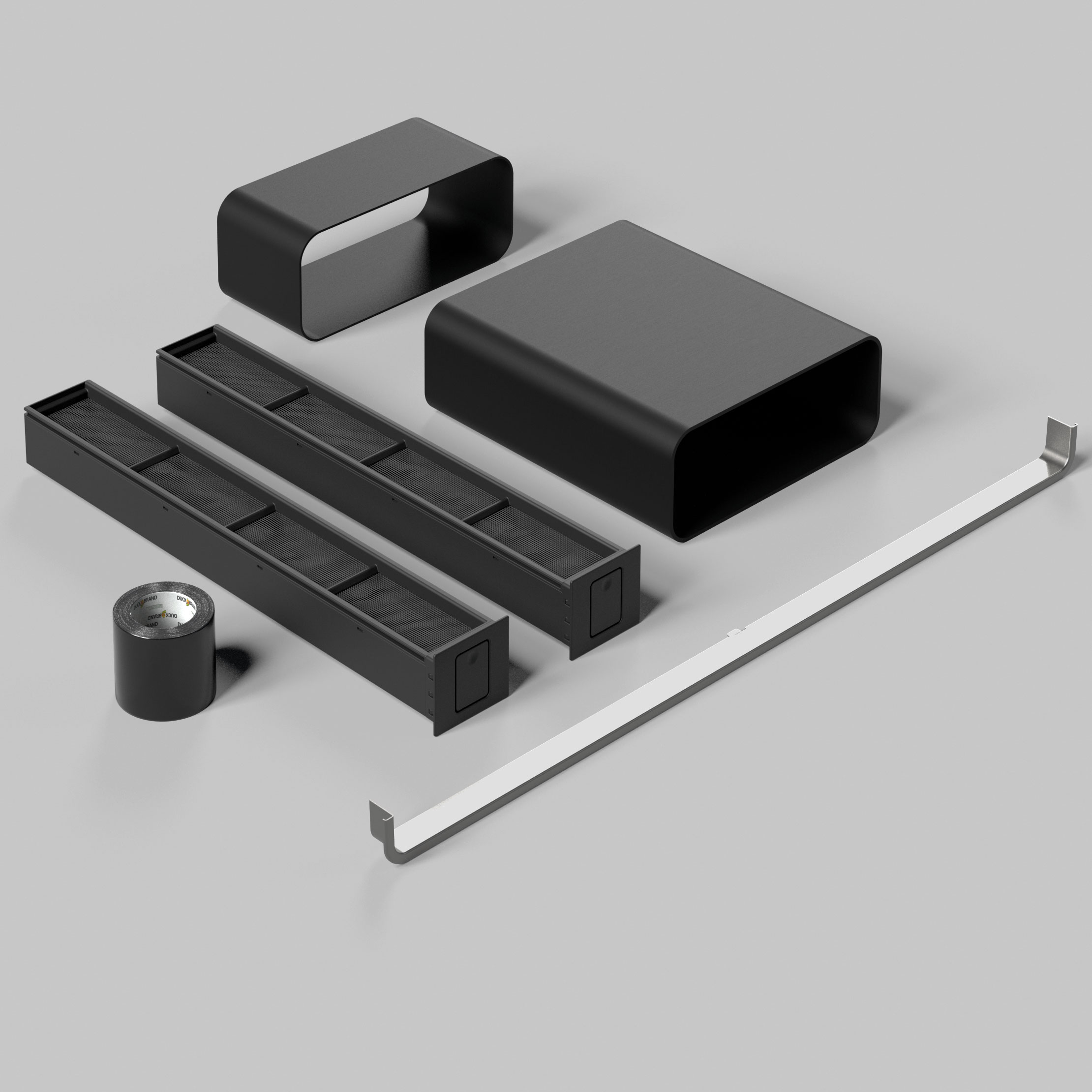Recirkulationskit inkluderer: Rørføring, recirkulationsfiltre, udblæsningsstuds til soklen og tape til at tætne sammenkobling af rørene, til udblæsning i fronten af soklen