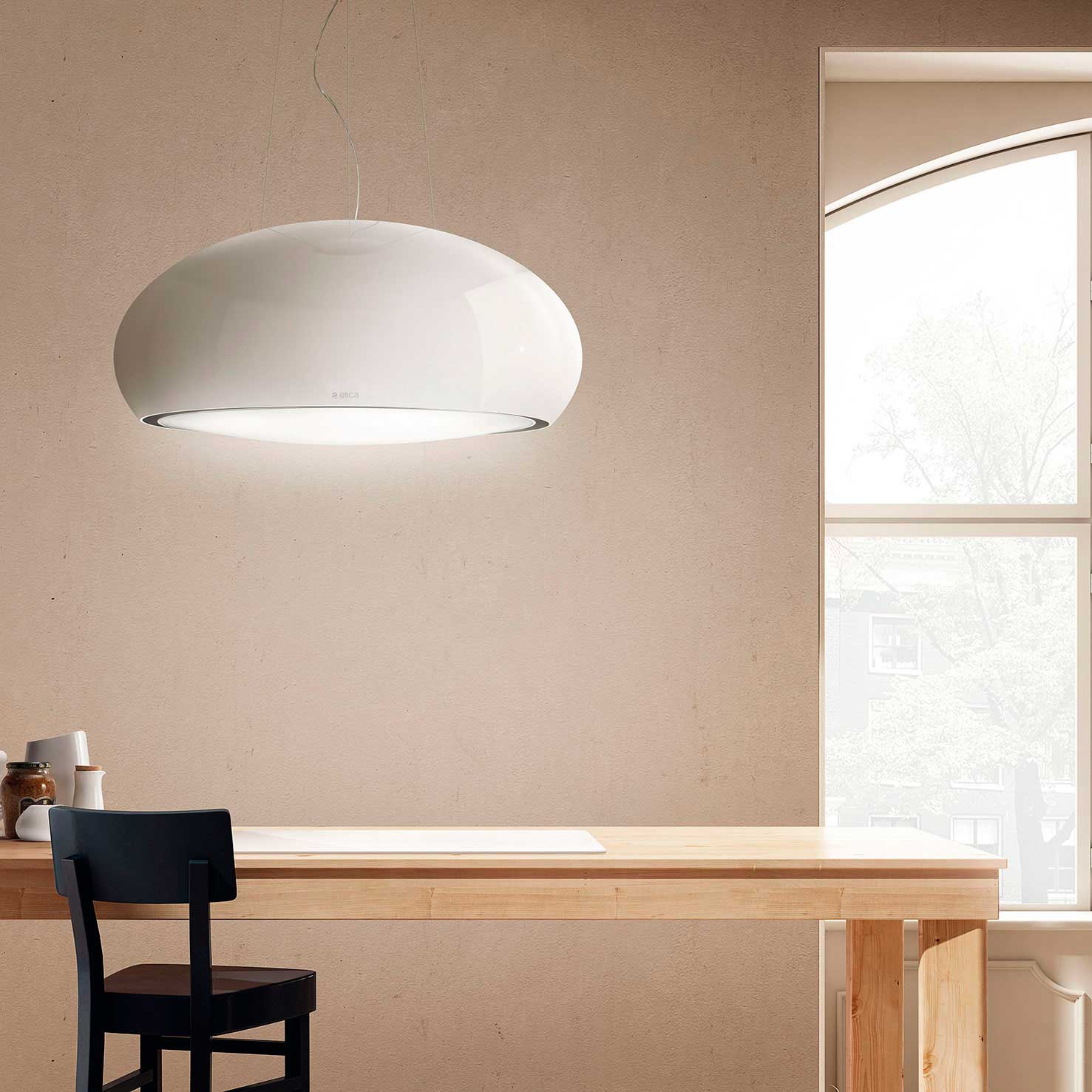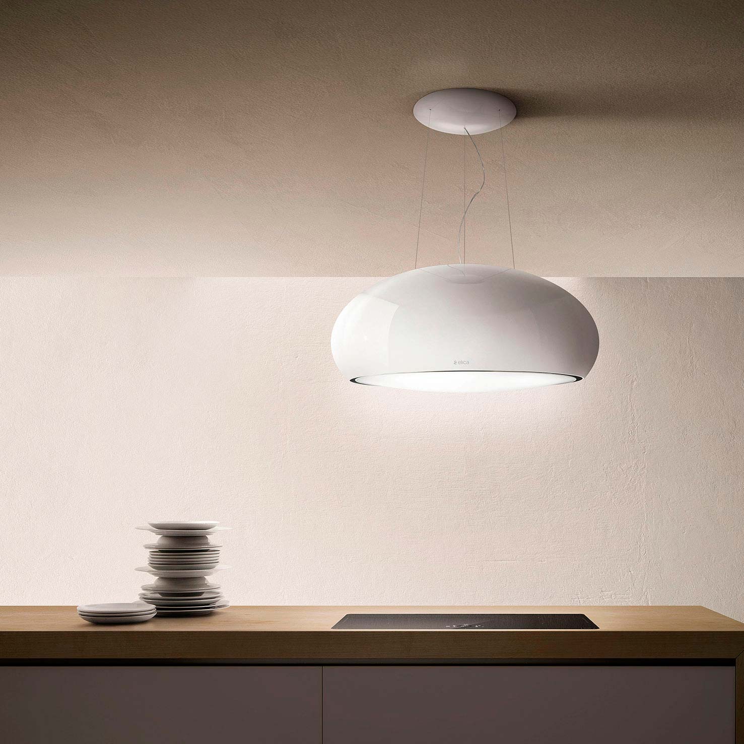 Wirehængt emhætte i perlehvid finish