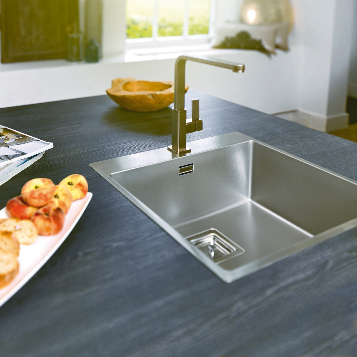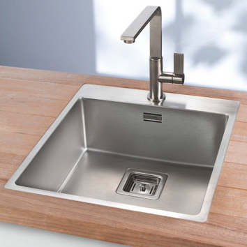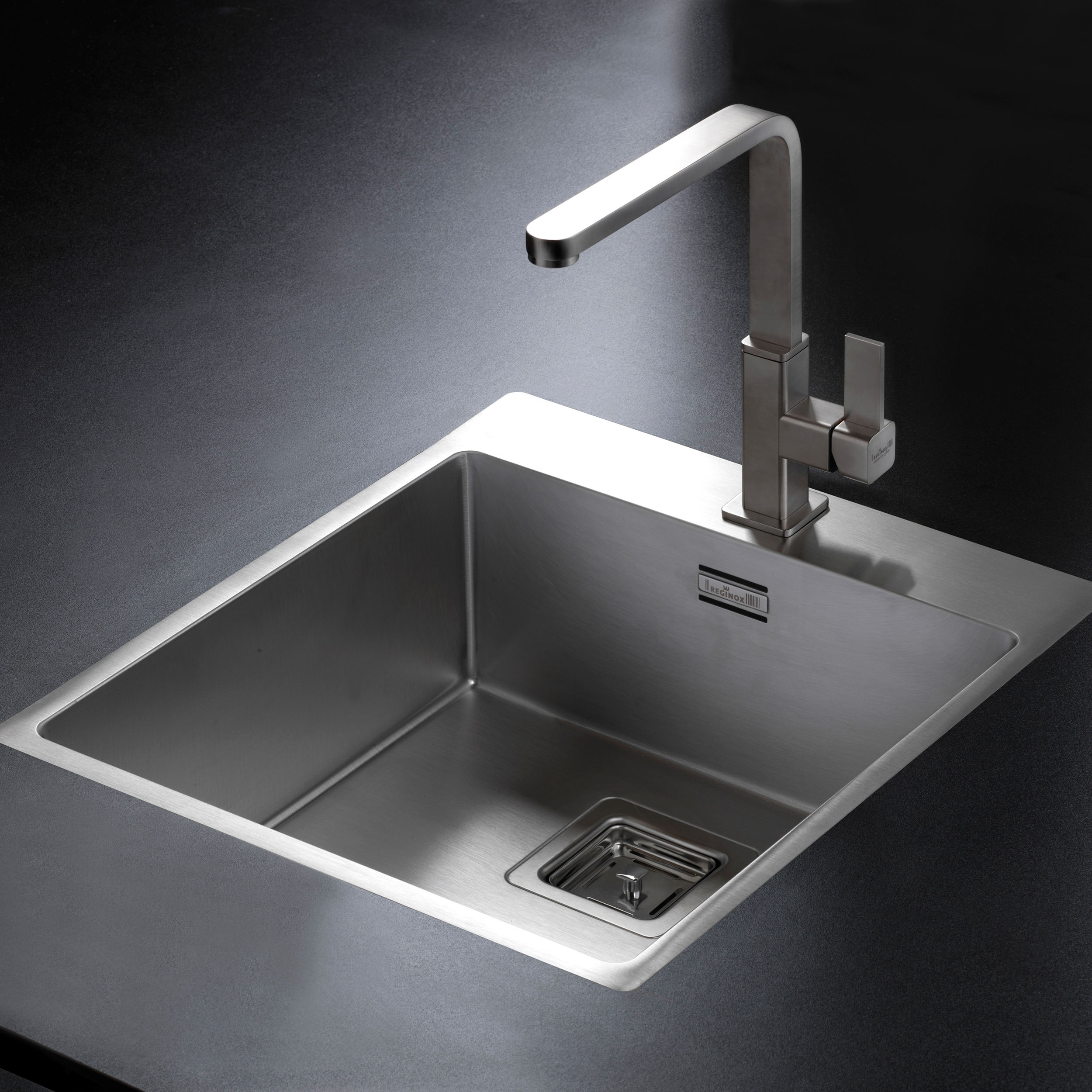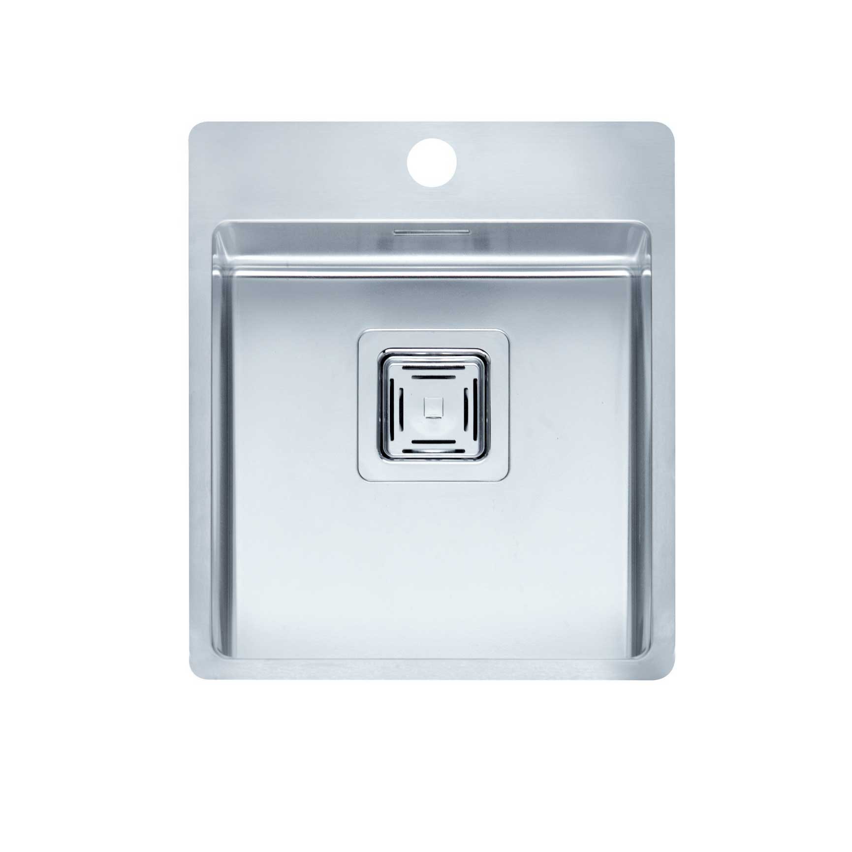 Stålvask. Enkelt kumme med bagkant. For under- eller planlimning. Indvendig hjørneradius 10. Kant 20 mm. Leveres med hanehul