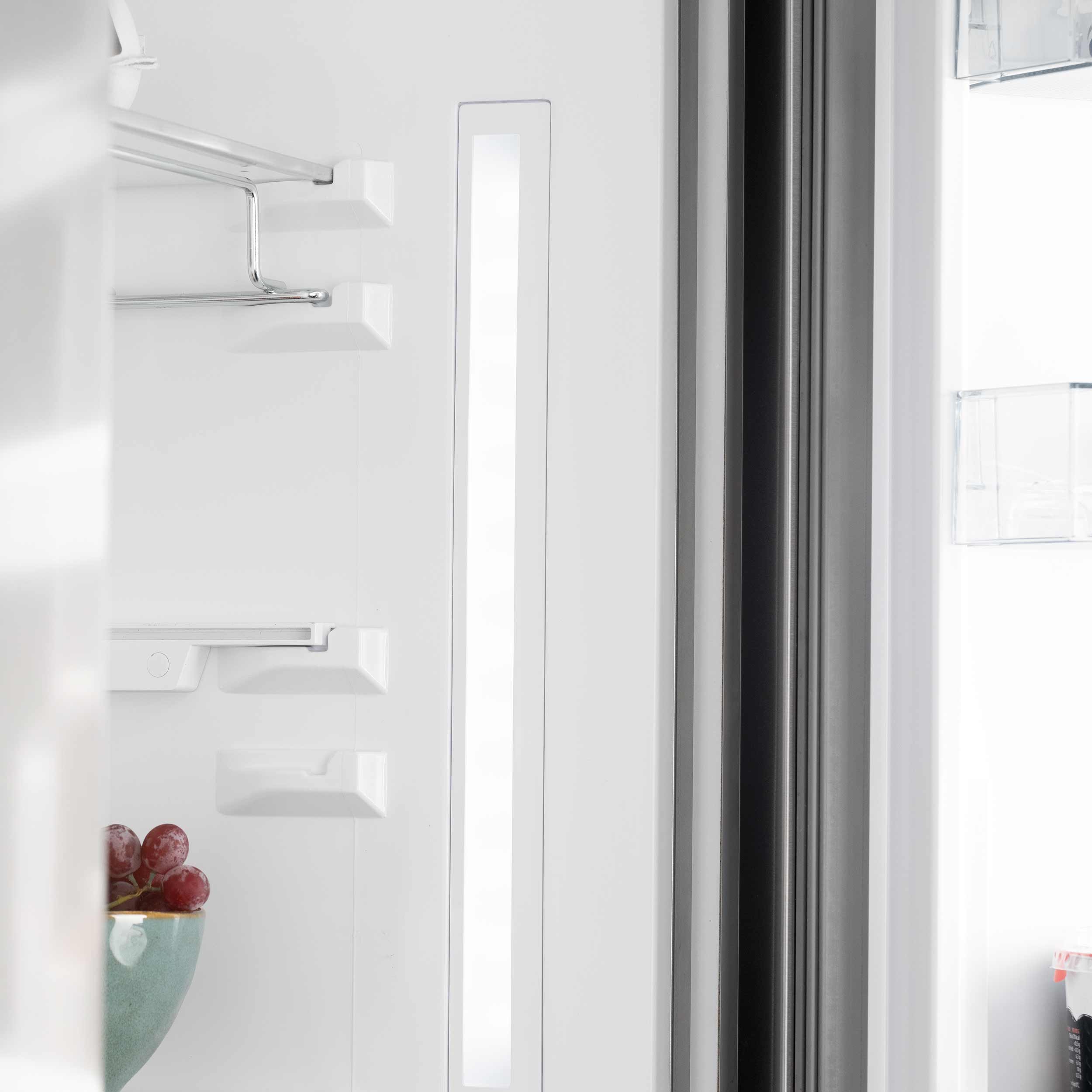 - Om belysning: LED-lysstribe i begge sider af køleskabet