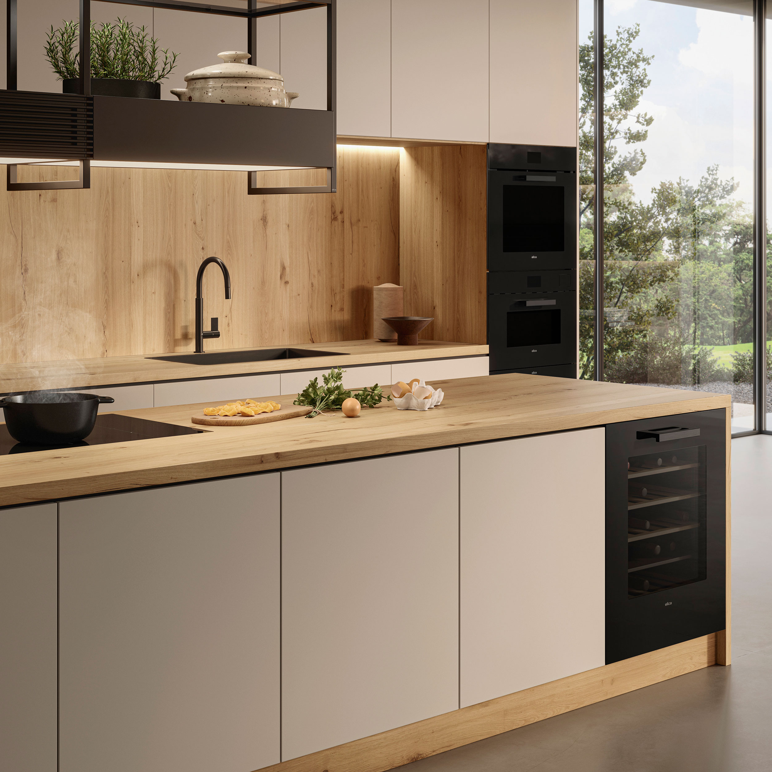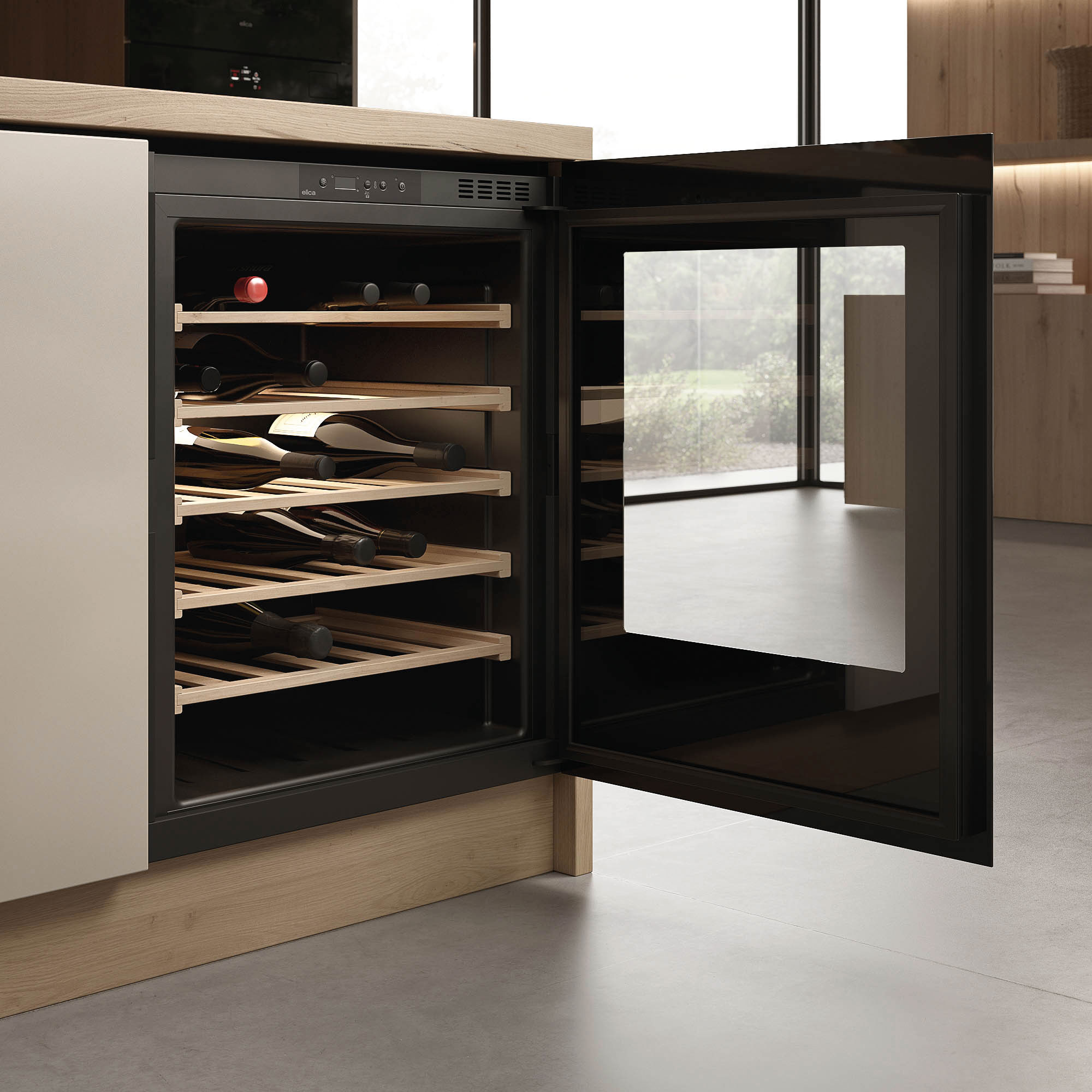 Rummeligt vinkøleskab med kapacitet til 36 flasker. To separate temperaturzoner til rød- og hvidvin. Elegant sort glasfront med UV-beskyttelse og vibrationsdæmpning for skånsom opbevaring.